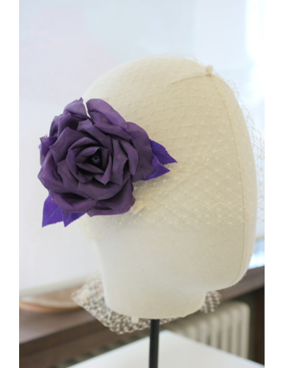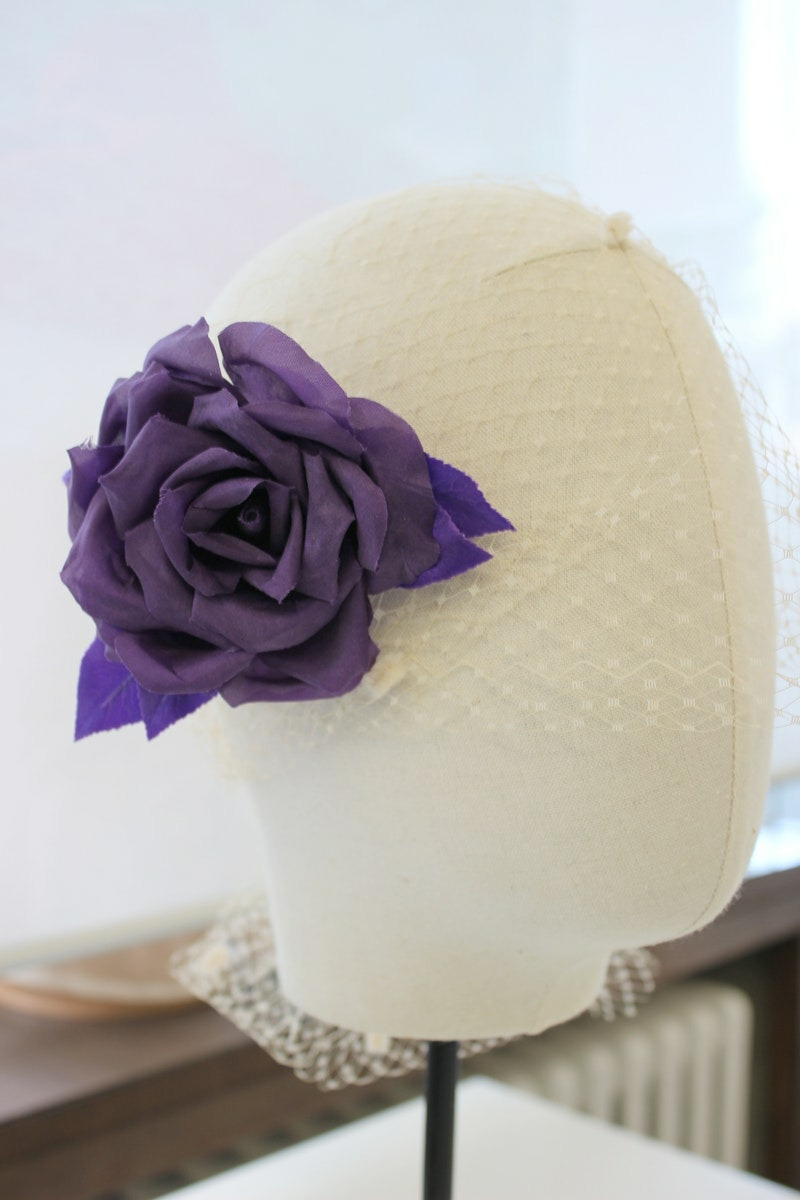 Rose En 100% Soie De Couleur Violette Avec Feuillage Assorti. La Fleur Est Façonnée À La Main. La Rose Peut Être Montée Sur Broche (Sur Demande) Pour Orner Un Vêtement Ou Un Accessoire. La Tige Est Flexible Et Permet De Mettre La Fleur Sur Un Chapeau, Ou L'Insérer Dans Une Coiffure , Par Exemple.