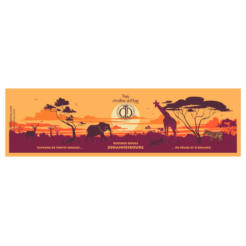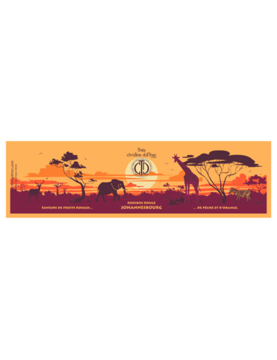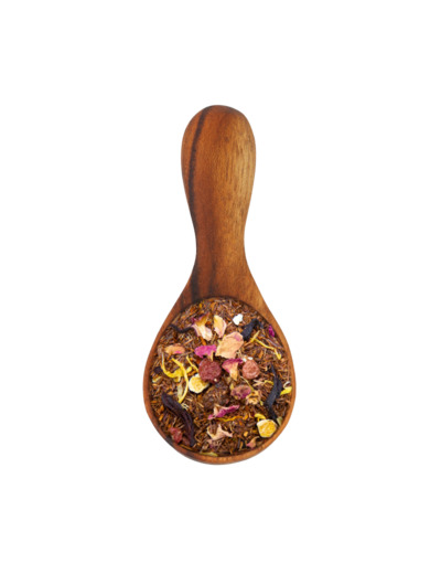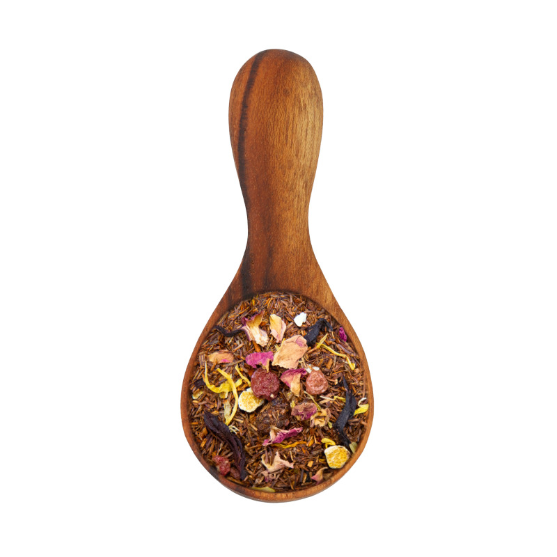 Rooibos rouge aromatisé à la pêche, à l'orange, aux fruits rouges, parsemé d'écorces et de morceaux de fruits.