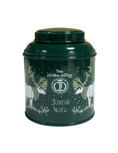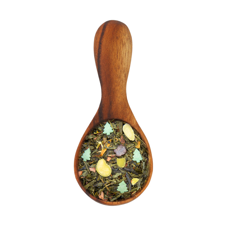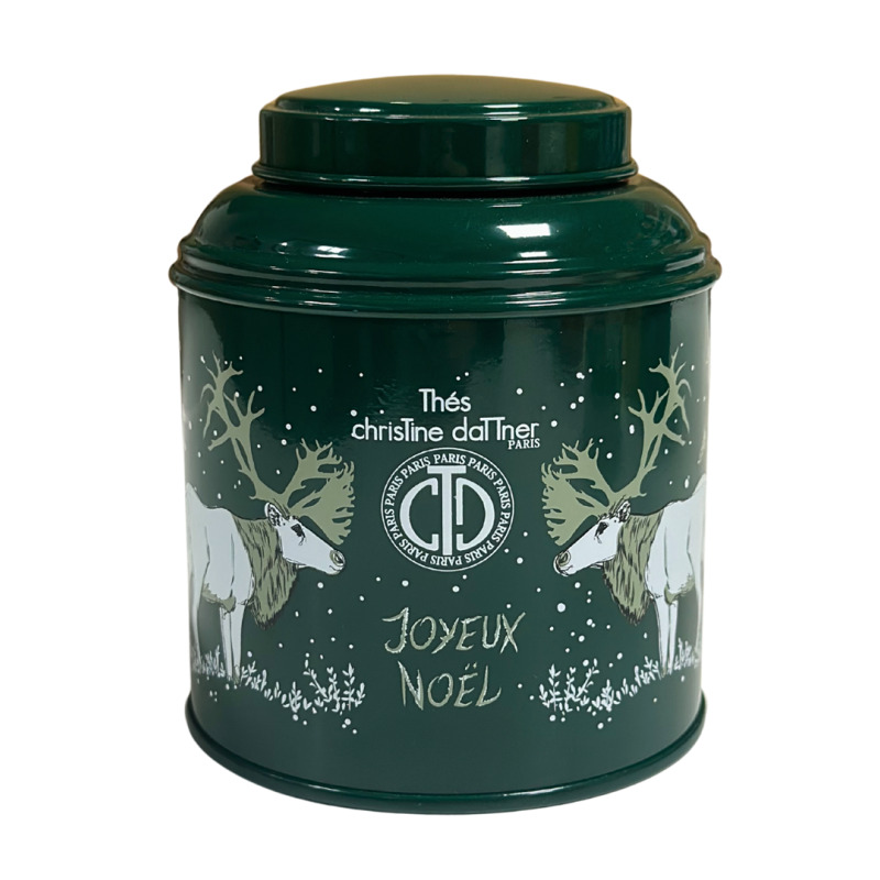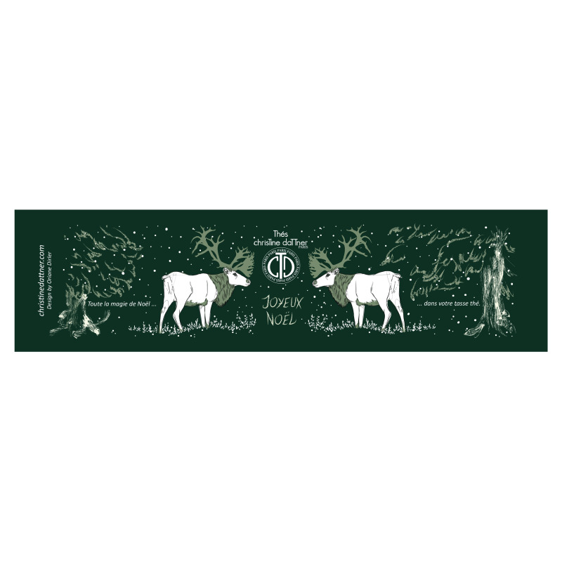 Thé vert ou noir aromatisé à l'orange, à l'amande et au chocolat, parsemé de petits sapins verts ou de petits flocons blancs.