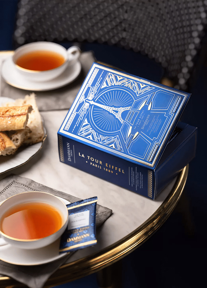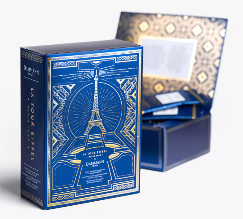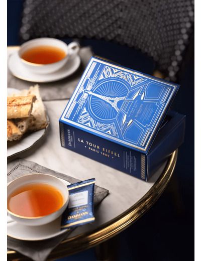 Présenté dans un coffret bleu nuit avec pour décor, la Tour Eiffel étincelante d’or qui se dresse rayonnante devant la perspective stylisée du Champ-de-Mars, un assortiment de 20 sachets Cristal® composé d’un thé classique, de trois thés aromatisés et d’une infusion : TOUR EIFFEL - Thé noir gourmand aux notes de vanille, d’amande et de rose. EARL GREY FLEURS - Thé noir à la bergamote. JARDIN DU TROCADÉRO - Thé vert fruité aux notes de rhubarbe, fraise des bois et fraise. ALTITUDE - Mélange classique de thés noirs de Darjeeling, Népal et Sikkim. MAGIC GINGER - Infusion épicée et fruitée aux notes d’aubépine, gingembre, citron vert et miel.