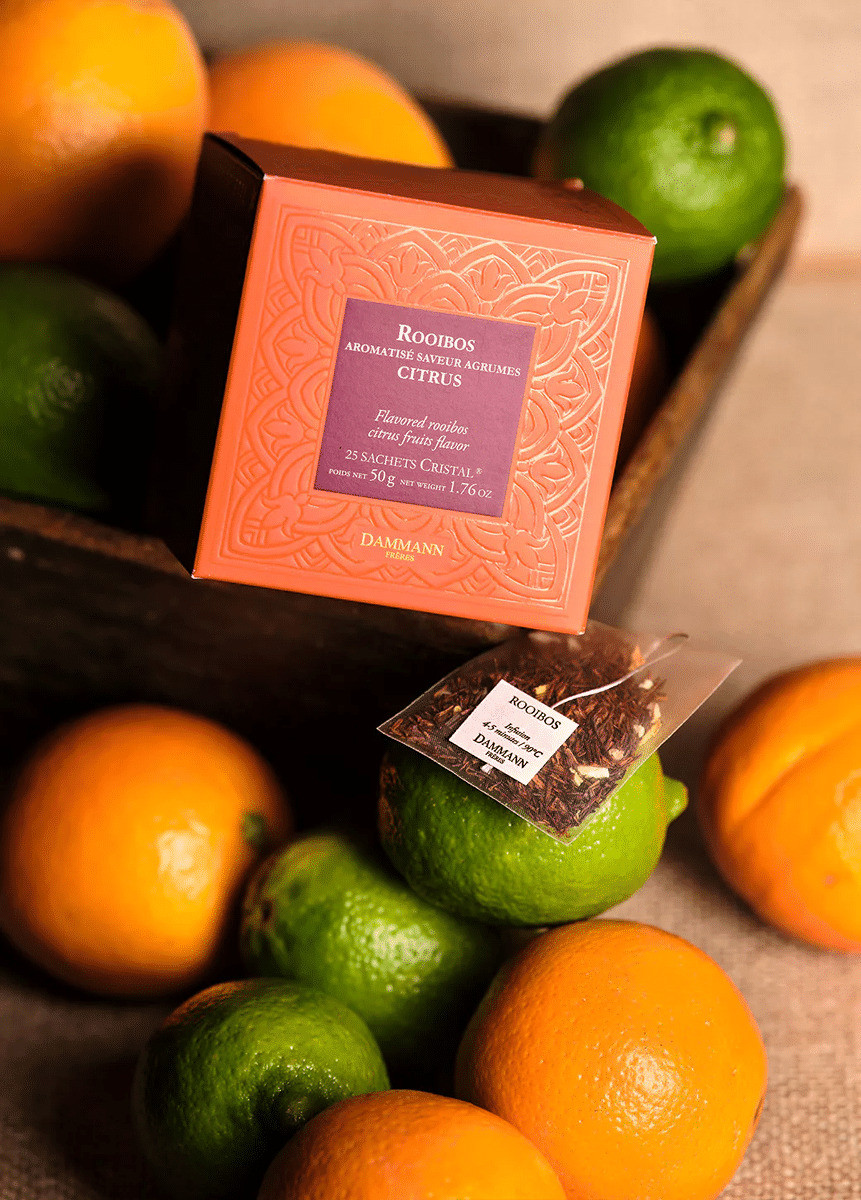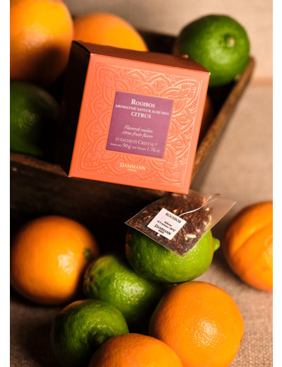 Mélange frais et équilibré de rooibos cederberg et d'huiles essentielles de citron vert, clémentine et orange sanguine et d'arôme kola. Quelques écorces d'orange et de pétales de fleurs d'hélianthe pour la beauté. Se consomme chaud ou glacé.