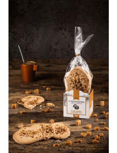 Éclats de caramel au beurre salé 10,2% (sucre, sirop de glucose, crème fraîche d'Isigny AOP, beurre salé d'Isigny AOP, sel de Guérande IGP, lécithine de colza)