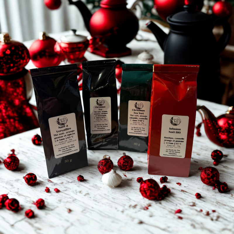 - Noël à Versailles: Thé noir épicé avec de la cannelle, du clou de girofle, du gingembre et des écorces d'orange et de l'ananas.