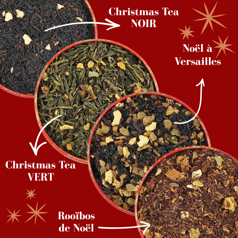 - Christmas Tea Vert: Aux notes d'hiver : pommes, écorces d'oranges, amande et cannelle. Idéal pour les journées d'hiver.