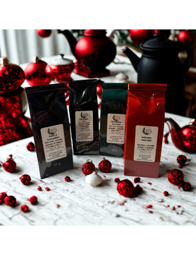- Christmas Tea: Mélange parfumé traditionnel de Noël sur un thé noir avec de l'orange, du caramel, du marasquin et ananas confits, idéal les journées d'hiver.