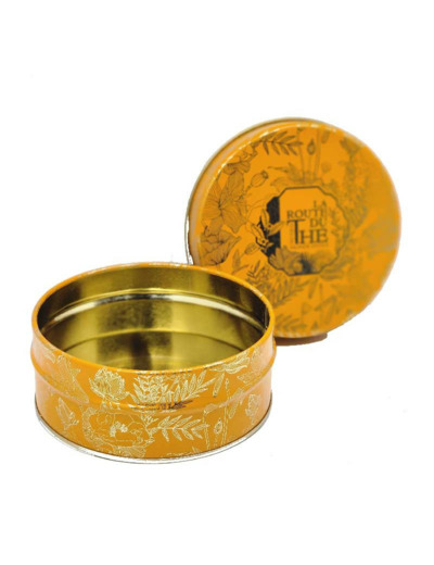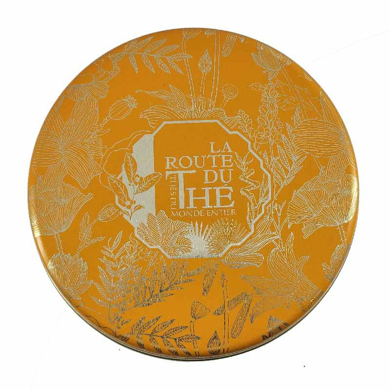 Boite vide en métal hermétique, jaune aux motifs la Route du Thé. Pratique pour une parfaite conservation des feuilles de thé.