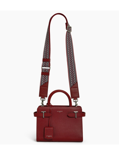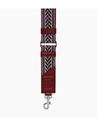Bandoulière ajustable en sangle tissée et cuir, avec éléments métalliques gravés finition argent et embossage Le Tanneur ton sur ton.