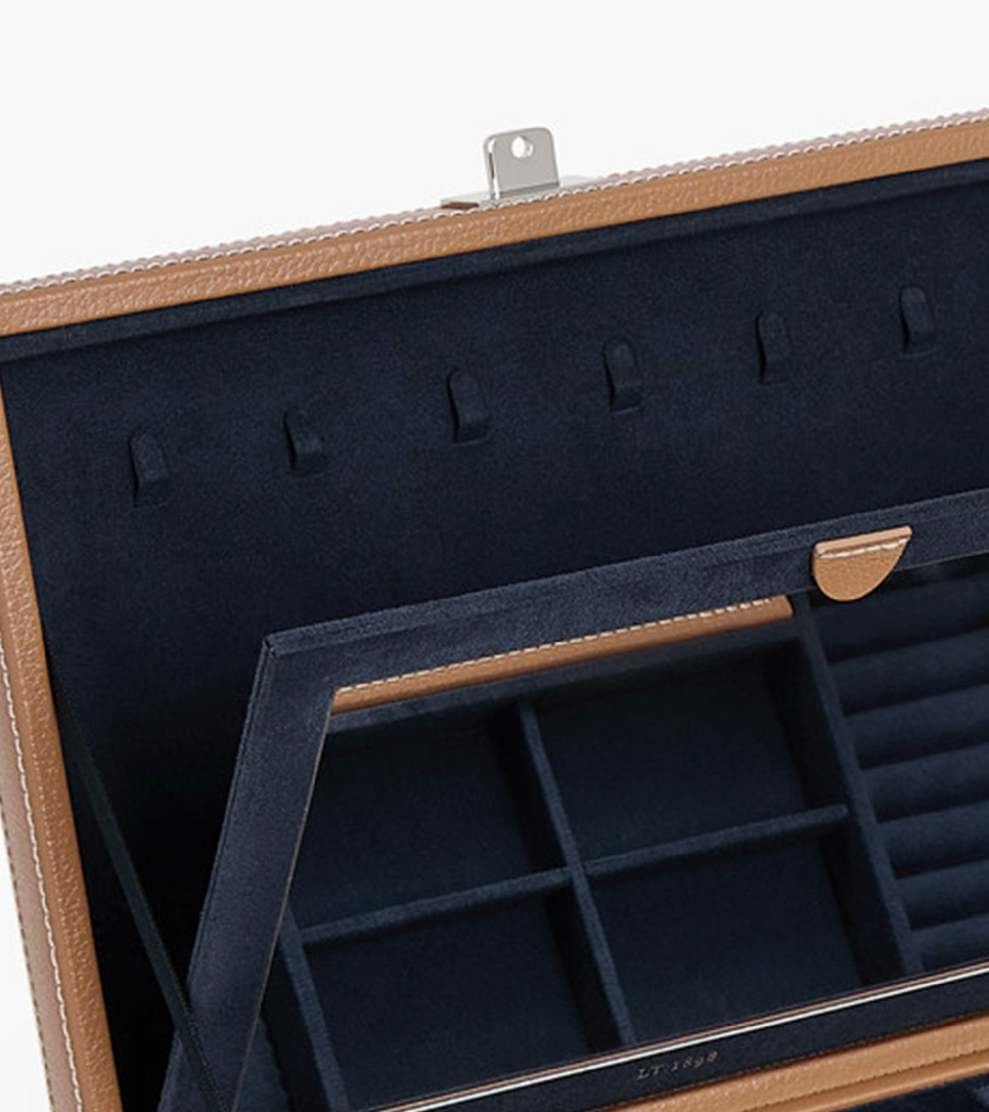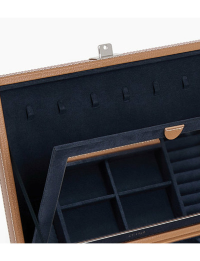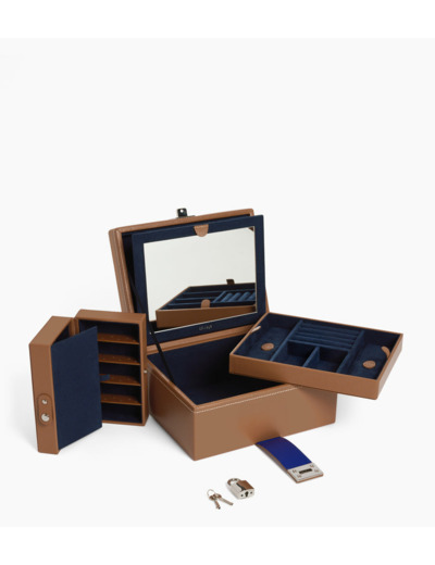 Boîte à bijoux moyen format avec miroir et compartiments amovibles. Marquage Le Tanneur et fermoir finition argent.