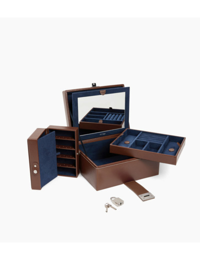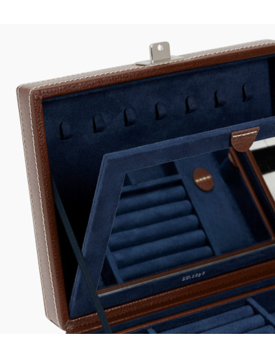 Boîte à bijoux moyen format avec miroir et compartiments amovibles. Marquage Le Tanneur et fermoir finition argent.
