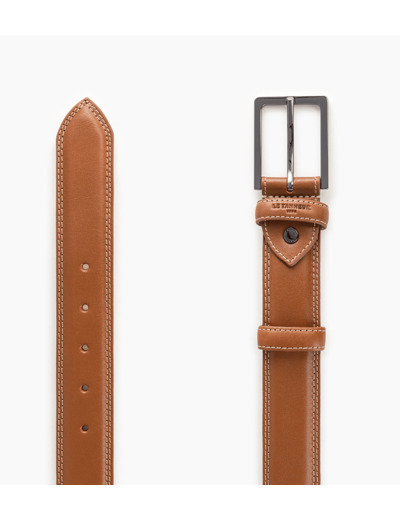 Ceinture en cuir piqué tannage végétal avec boucle finition gun metal gravée Le Tanneur. Ce modèle comporte un intérieur nubuck et un passant marqué ton sur ton.