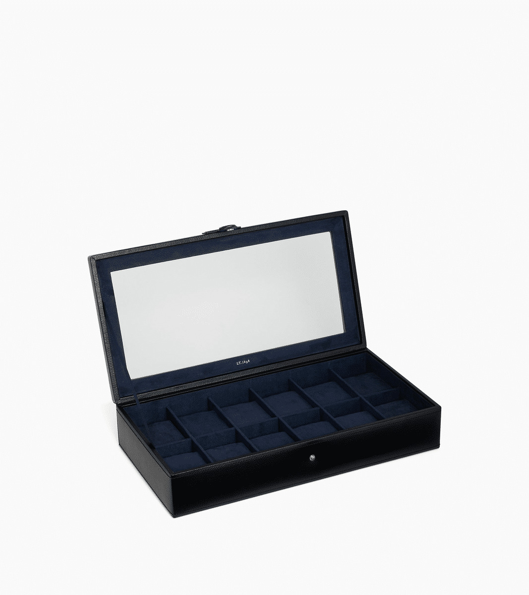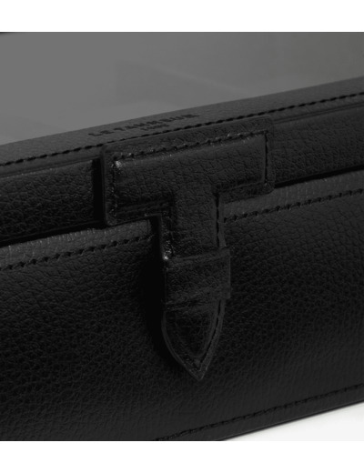 Coffret douze montres vitré avec doublure velours, marquage Le Tanneur ton sur ton et fermoir en T signature.