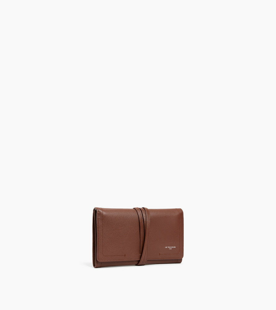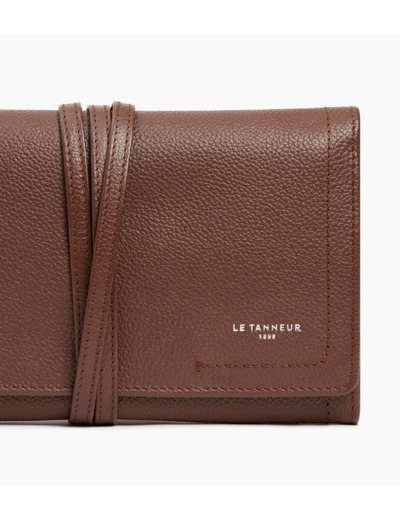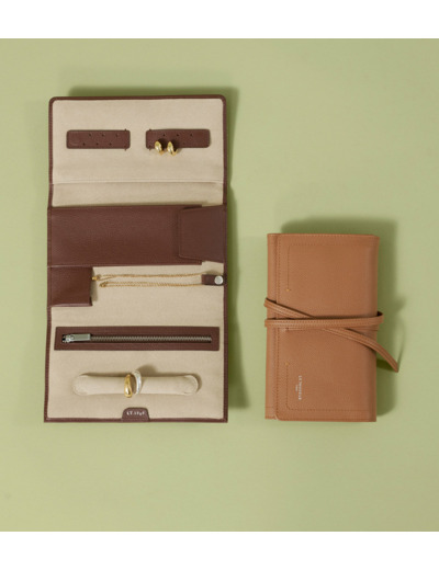 Étui à bijoux souple de voyage avec compartiment montre et poche zippée. Embossage Le Tanneur et bouclerie finition argent. Fermoir avec lanière en cuir.