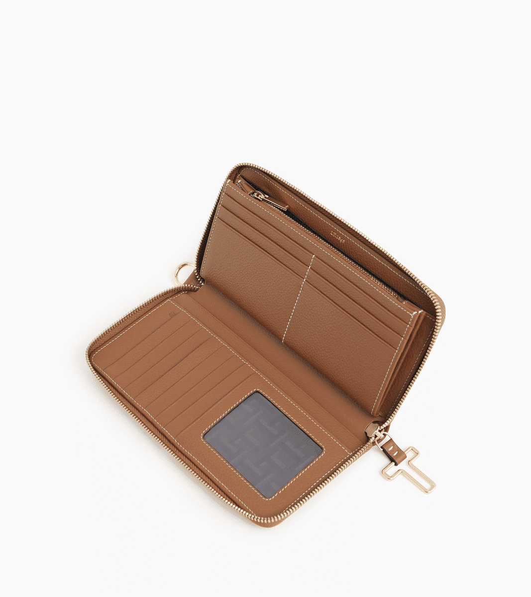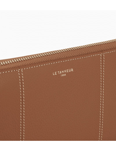Compagnon zippé en cuir signature avec dragonne amovible. Zip, marquage Le Tanneur et charms T signature finition doré clair. Sécurité anti-RFID.