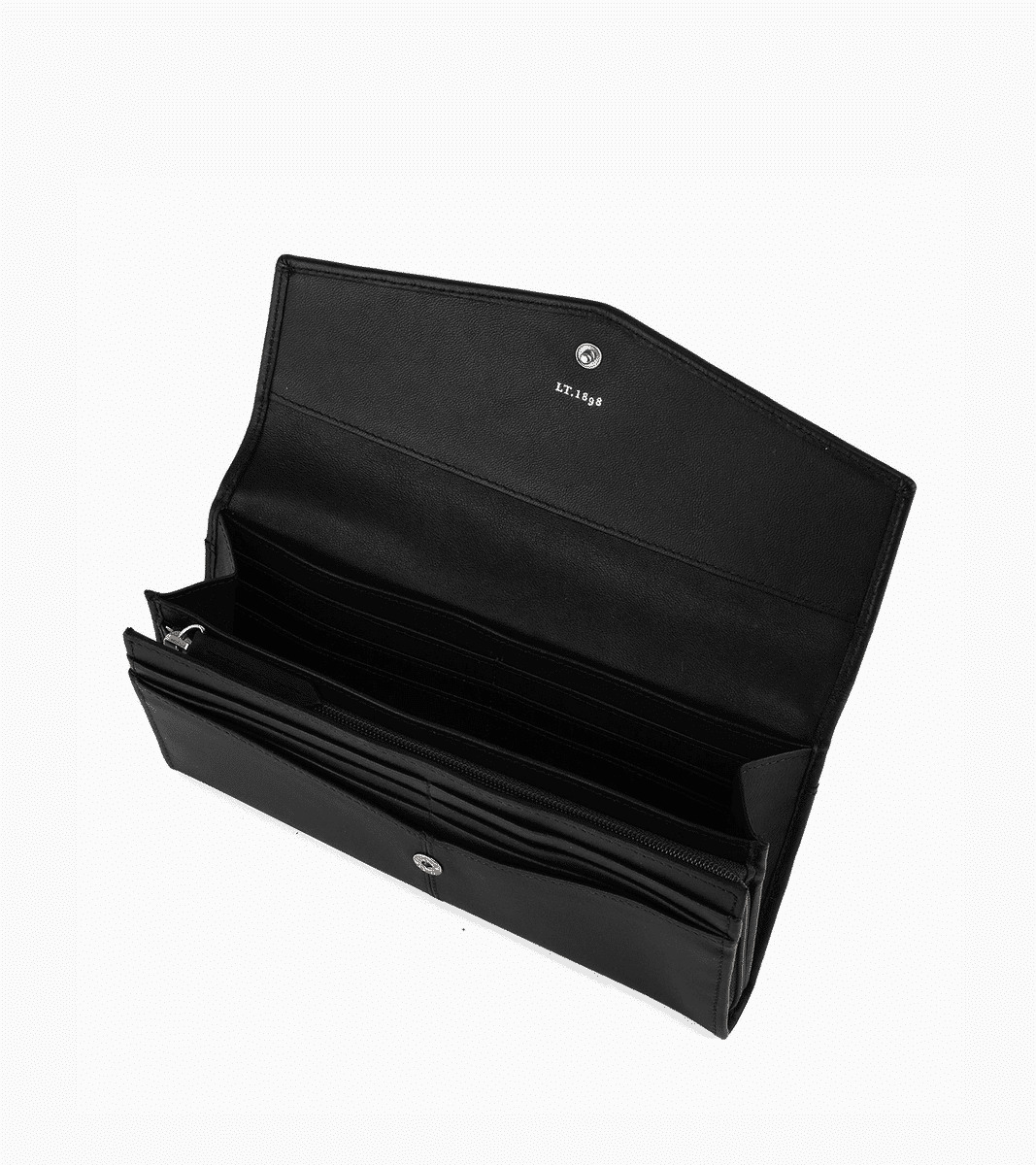 Grand portefeuille à rabat avec poche zippée. Marquage Le Tanneur et fermeture pression finition argent. Sécurité anti-RFID.