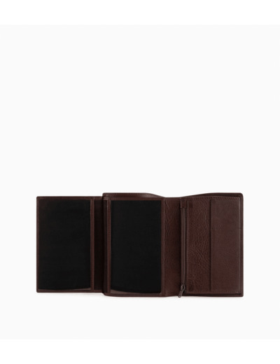 3 poches plates, 2 poches ID, 1 poche monnaie zippée, 2 poches billets et 8 compartiments cartes.