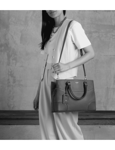 Grand sac à main avec étiquette de bagage amovible et poignées signature. Logo Le Tanneur et éléments métalliques finition argentée. Peut être porté à la main, à l'épaule ou en bandoulière grâce à sa sangle ajustable et amovible.
