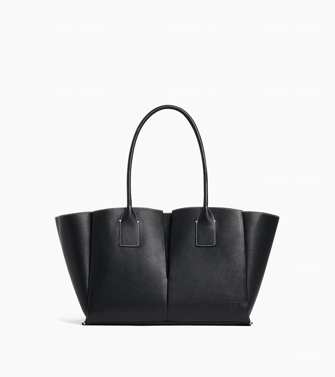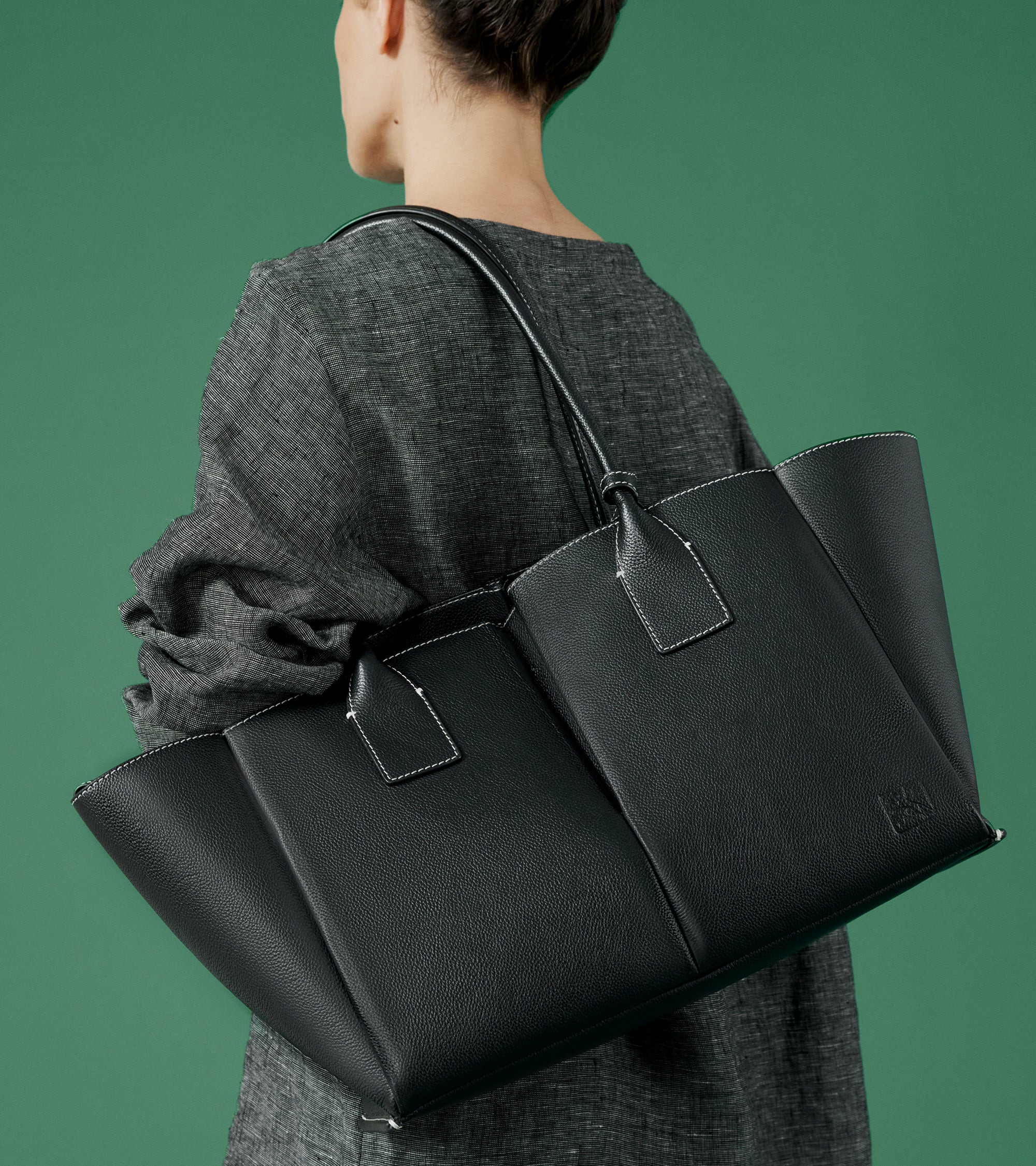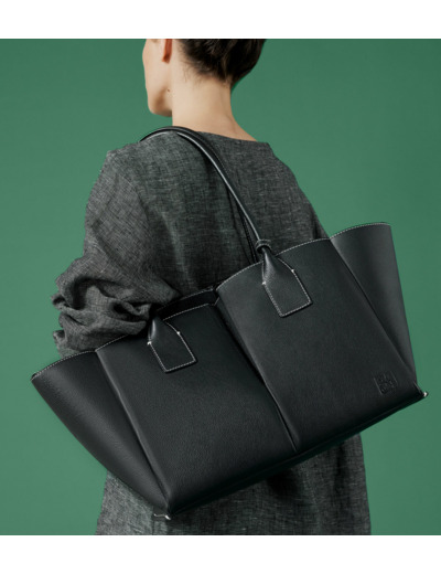 Grand sac cabas avec pochette amovible, miroir de courtoisie et marquage Le Tanneur ton sur ton. Doublure suède en microfibre. Porté main ou épaule. Peut contenir un ordinateur 14".