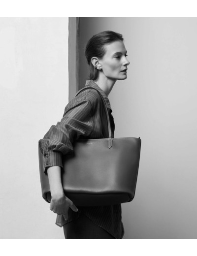 Grand sac cabas zippé en cuir grainé double face intérieur contrasté et pochette amovible. Porté épaule.