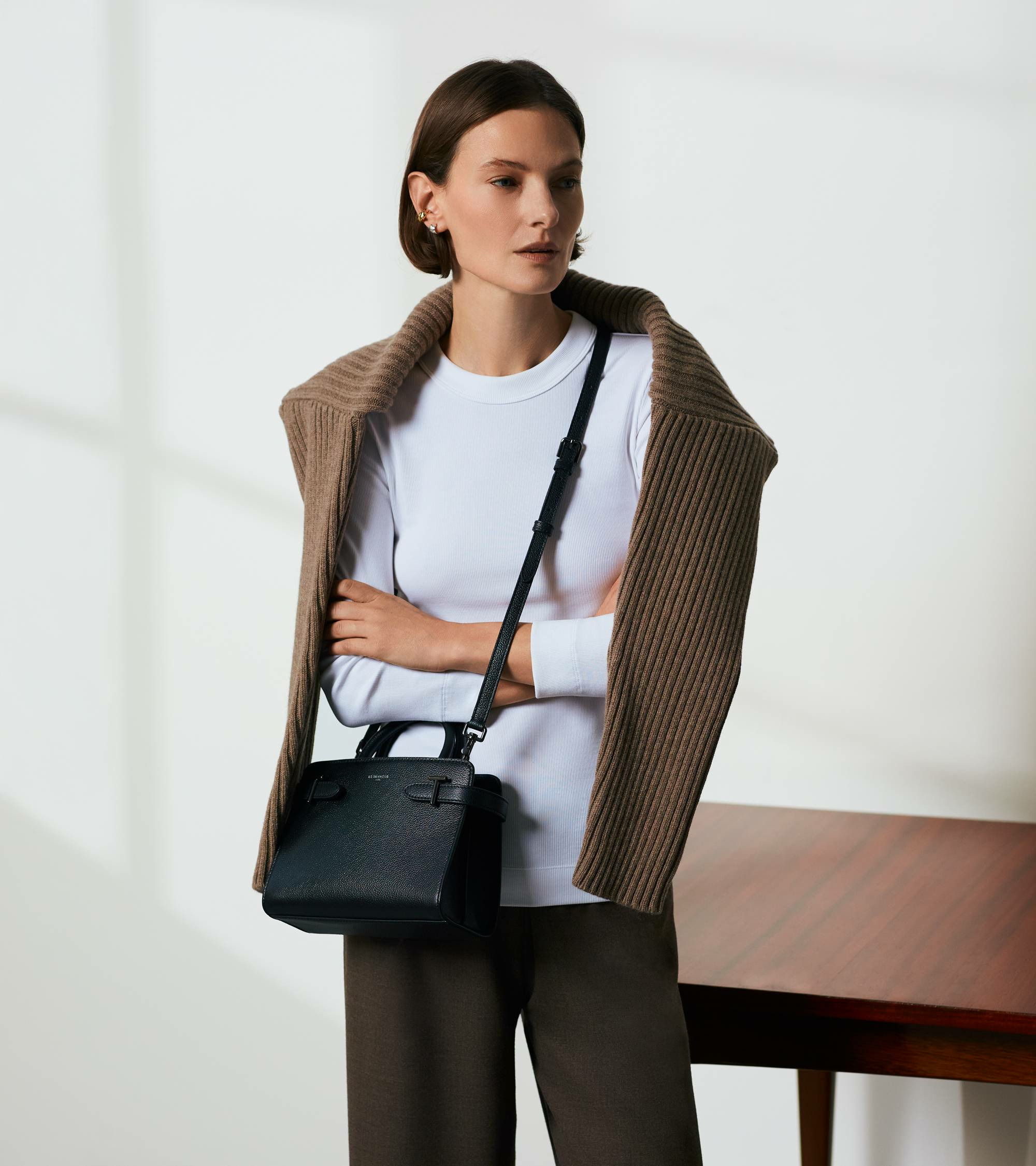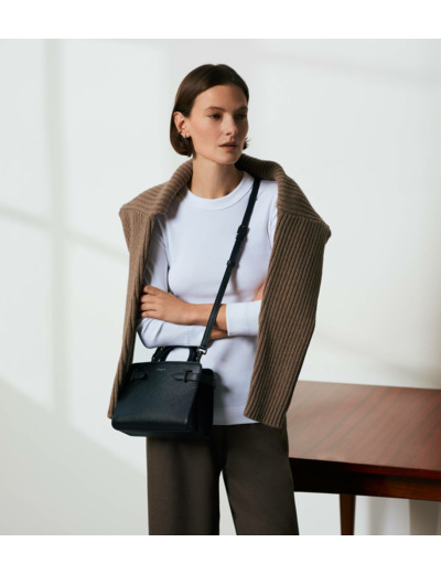 Petit sac à main avec poignées toron et trois compartiments dont un zippé. Pièces T métalliques signature de la ligne. Charms embossé Le Tanneur amovible. Porté main, épaule ou croisé grâce à sa bandoulière ajustable et amovible.