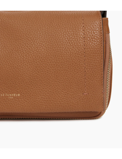 Besace à rabat petit modèle avec marquage Le Tanneur et doublure Crépuscule. Porté croisé ou épaule grâce à ses deux bandoulières ajustables.