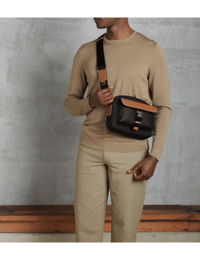 Petit sac bandoulière bi-matière avec fermoir T signature finition argent brossé et marquage Le Tanneur ton sur ton. Porté épaule ou croisé grâce à sa bandoulière ajustable.