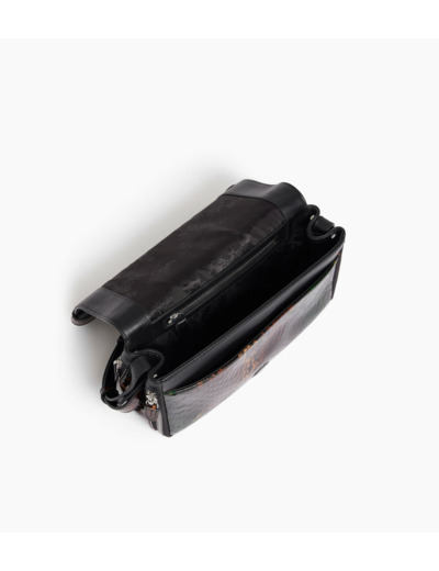 2 poches plates et 1 poche zippée. 2 soufflets zippés, 1 poche arrière boutonnée aimantée. Bandoulière ajustable et mini bandoulière portée épaule.