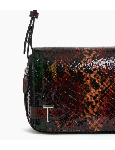 Petit sac bandoulière en cuir effet python avec relief unique pour chaque sac. Modèle avec deux soufflets, double T signature, doublure jacquard anniversaire et marquage Le Tanneur sur film argent. Porté épaule ou croisé grâce à sa bandoulière ajustable.