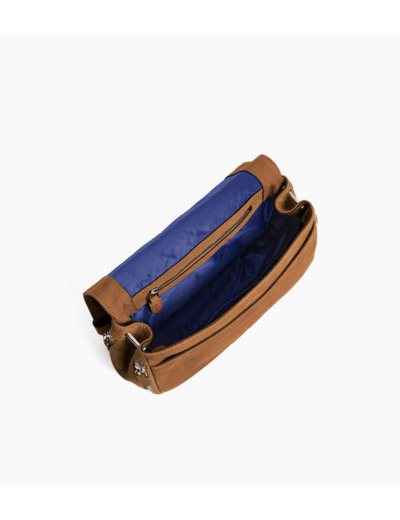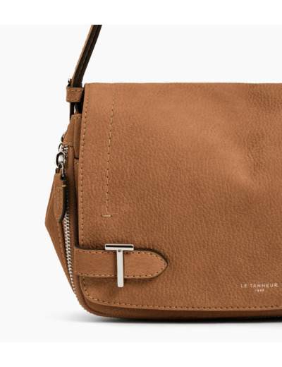 Petit sac bandoulière en cuir nubuck graine avec deux soufflets, doublure jacquard anniversaire, marquage Le Tanneur sur film argent et double T signature. Porté épaule ou croisé grâce à sa bandoulière ajustable.