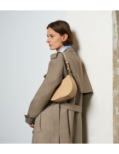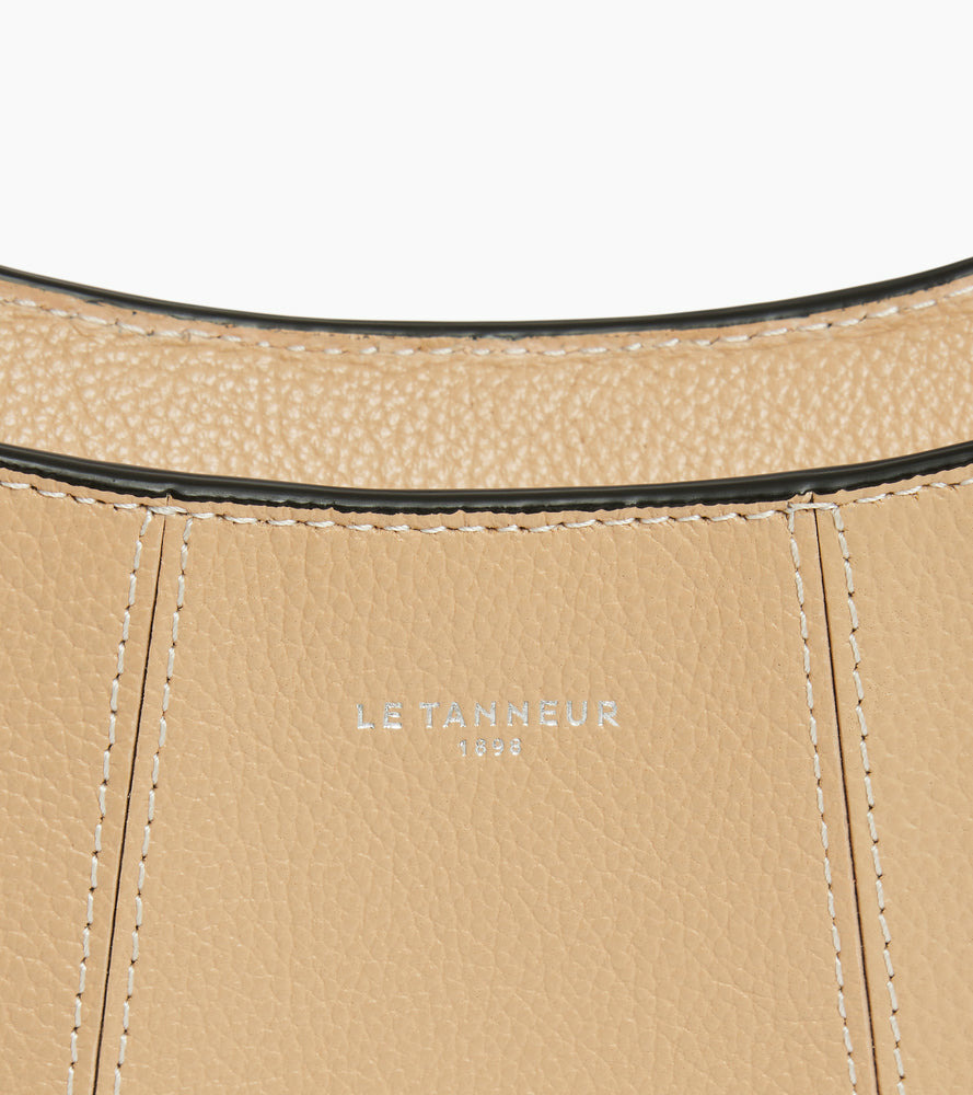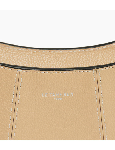 Petit sac demilune avec doublure jacquard crépuscule et marquage Le Tanneur. Double porté grâce à sa mini bandoulière porté épaule amovible et sa bandoulière porté croisé ajustable et amovible.