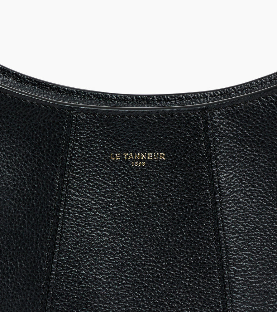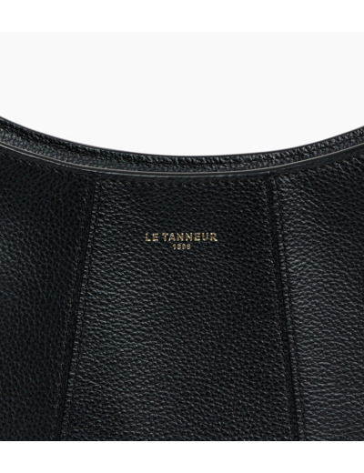 Petit sac demi-lune avec doublure jacquard crépuscule et marquage Le Tanneur. Double porté grâce à sa mini bandoulière porté épaule amovible et sa bandoulière porté croisé ajustable et amovible.