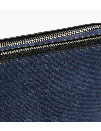 Sacoche portefeuille zippée en cuir effet denim avec marquage Le Tanneur ton sur ton et bandoulière ajustable et amovible. Éléments métalliques et marquage Le Tanneur finition argent.