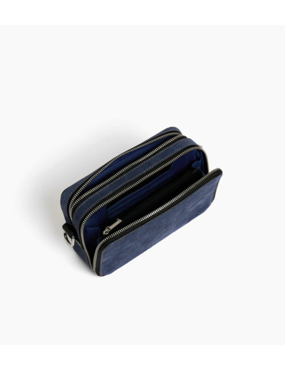 Cuir de veau refente de cuir suède effet denim. Doublure textile Le Bleu.