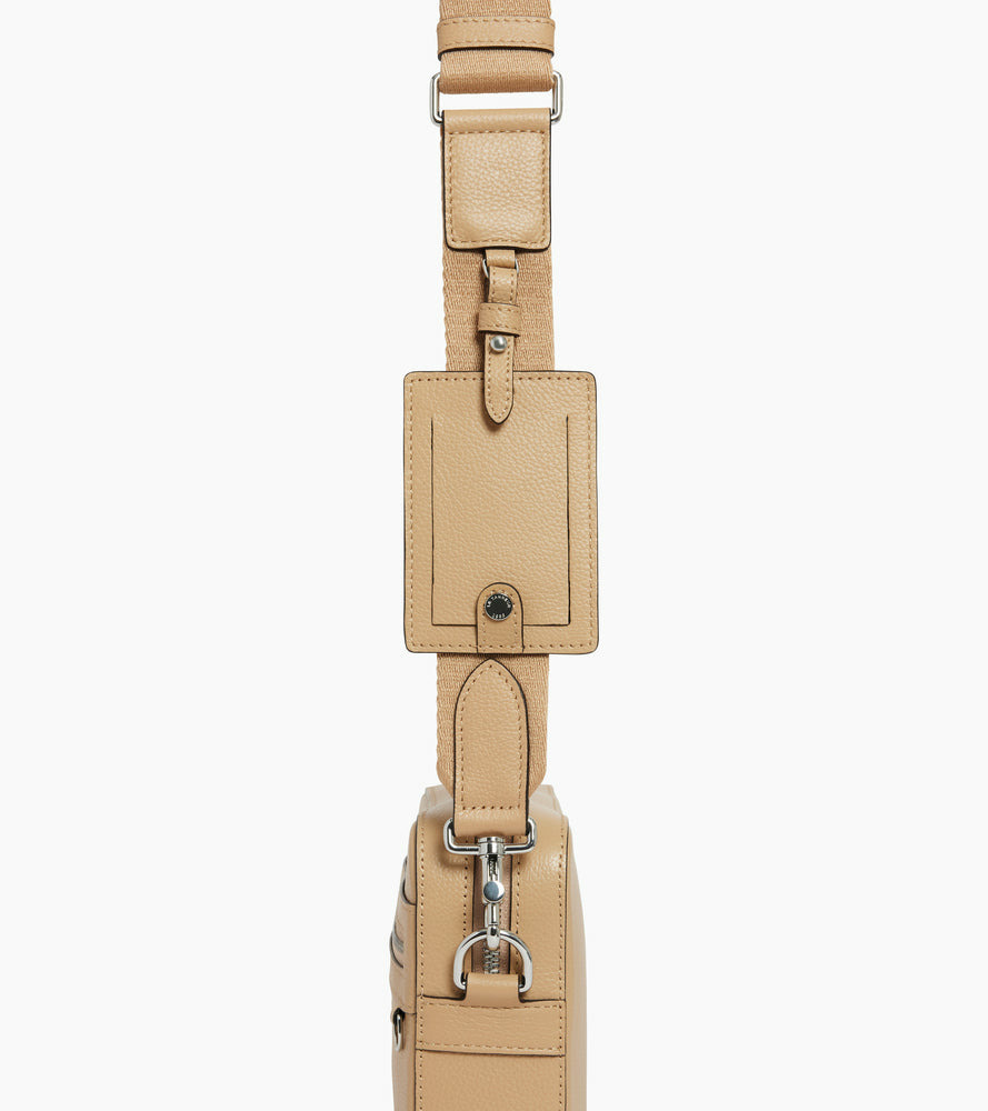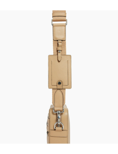Camera bag marqué Le Tanneur avec portebadge amovible, doublure Le Bleu et éléments métalliques finition argent. Porté main, épaule ou croisé grâce à sa bandoulière ajustable et amovible.
