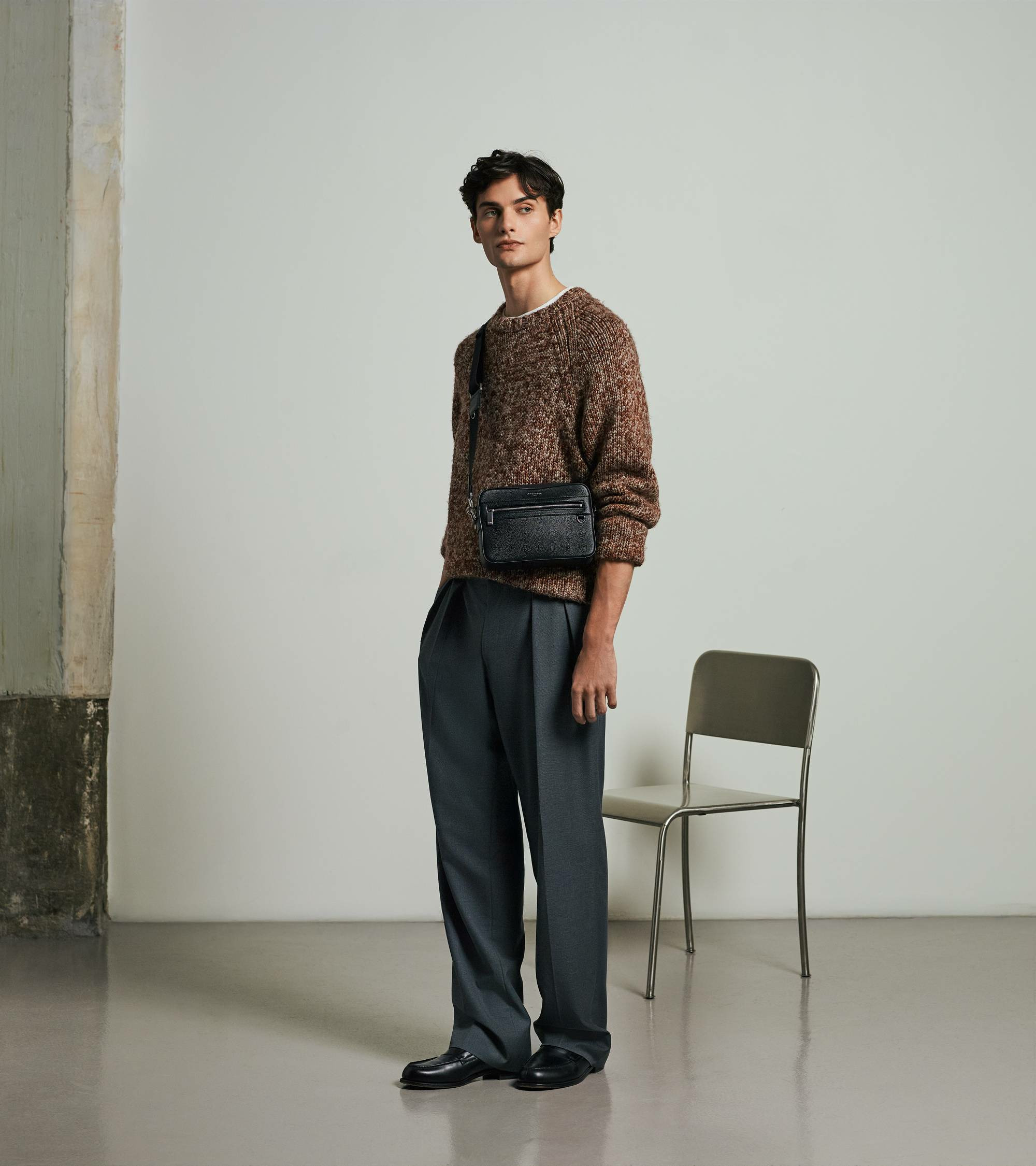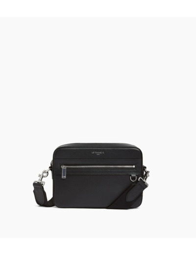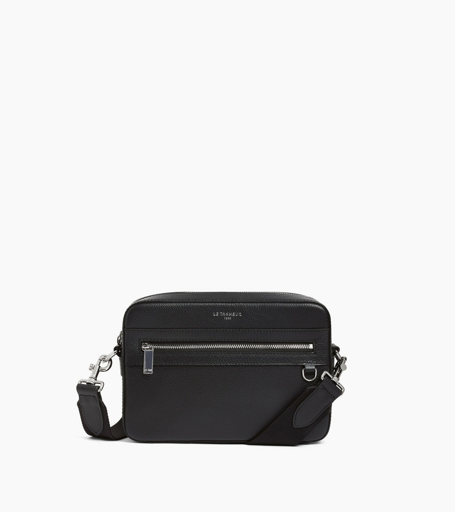 Camera bag marqué Le Tanneur avec porte-badge amovible, doublure Le Bleu et éléments métalliques finition argent. Porté main, épaule ou croisé grâce à sa bandoulière ajustable et amovible.