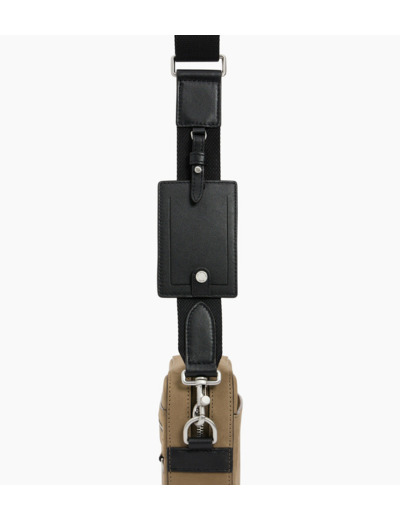 Camera bag marqué Le Tanneur avec porte-badge amovible et éléments métalliques finition argent. Porté main, épaule ou croisé grâce à sa bandoulière ajustable et amovible.