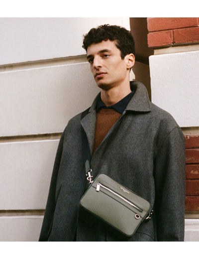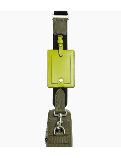 Camera bag marqué Le Tanneur avec porte-badge amovible et éléments métalliques finition argent. Porté main, épaule ou croisé grâce à sa bandoulière ajustable et amovible.