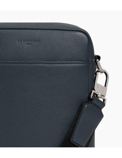 Petit sac bandoulière avec éléments métalliques gravés et marquage Le Tanneur ton sur ton. Doublure 100% coton bleu marine. Porté épaule ou croisé grâce à sa bandoulière ajustable et amovible.