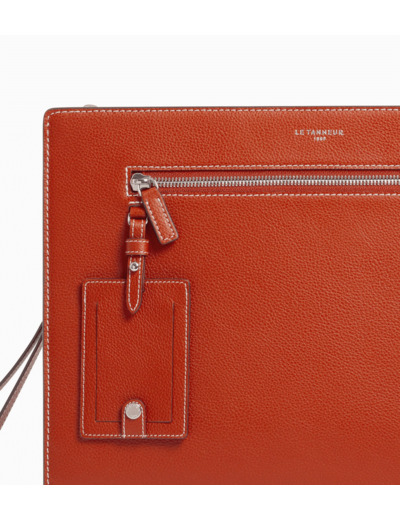 Pochette A4 finition argent avec charms amovible et marquage Le Tanneur en lettres métal argentées.