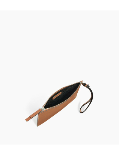 Pochette zippée avec dragonne amovible et éléments métalliques finition argent.