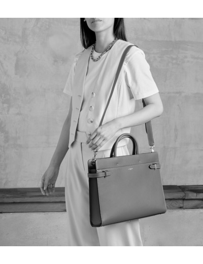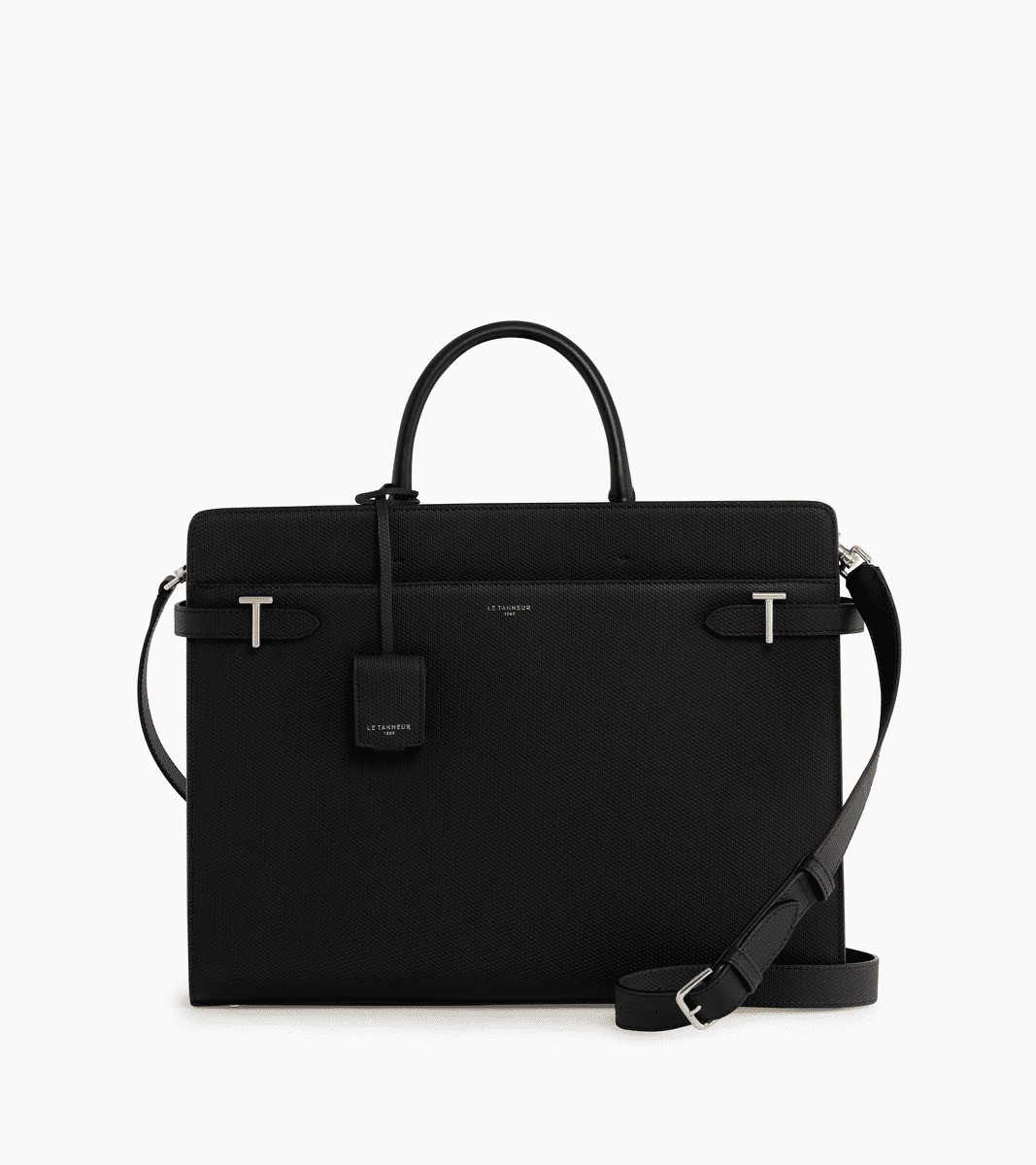 Porte-documents avec poche ordinateur, passant trolley, fermoirs T signature et marquage Le Tanneur. Porte-étiquette amovible. Porté main, épaule ou croisé grâce à sa bandoulière ajustable et amovible.