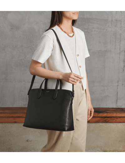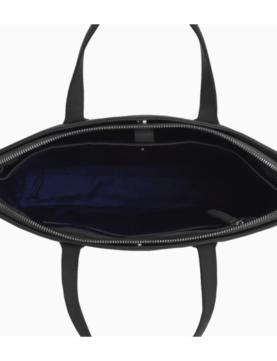 Porte-documents avec poche pour ordinateur 14", boucle trolley et détails de poignées signature. Marquage Le Tanneur et fermeture éclair argentée. Porté à la main, à l'épaule ou en bandoulière avec sangle ajustable et amovible.