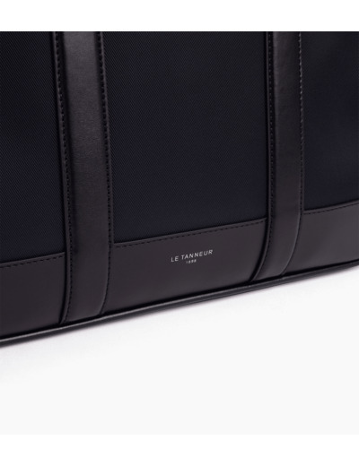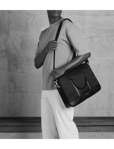 Porte-documents en toile polyamide avec renfort cuir. Bandes ajustées piquées en T, signature de la Maison. Portez-le à la main, croisé ou à l’épaule avec sa bandoulière amovible. Peut accueillir un ordinateur portable 15”.