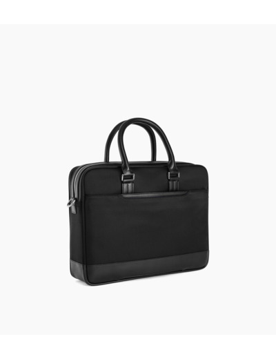 Porte-documents en toile polyamide avec renfort cuir. Bandes ajustées piquées en T, signature de la Maison. Portez-le à la main, croisé ou à l’épaule avec sa bandoulière amovible. Peut accueillir un ordinateur portable 15”.