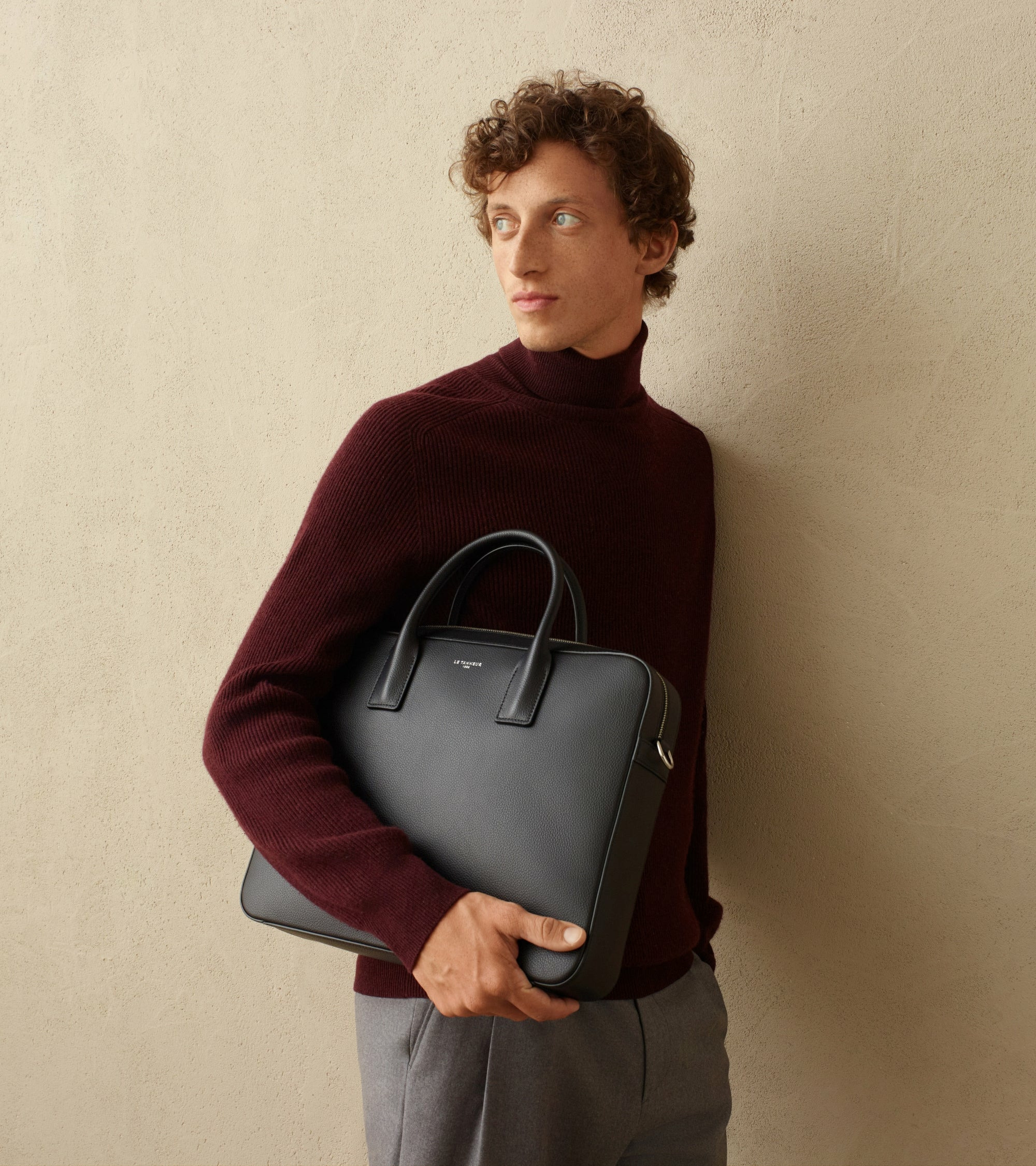 Porte-documents 14 finition argent avec poche ordinateur, passant trolley, charms amovible et marquage Le Tanneur sur film argent. Porté main, épaule ou croisé grâce à sa bandoulière ajustable et amovible."