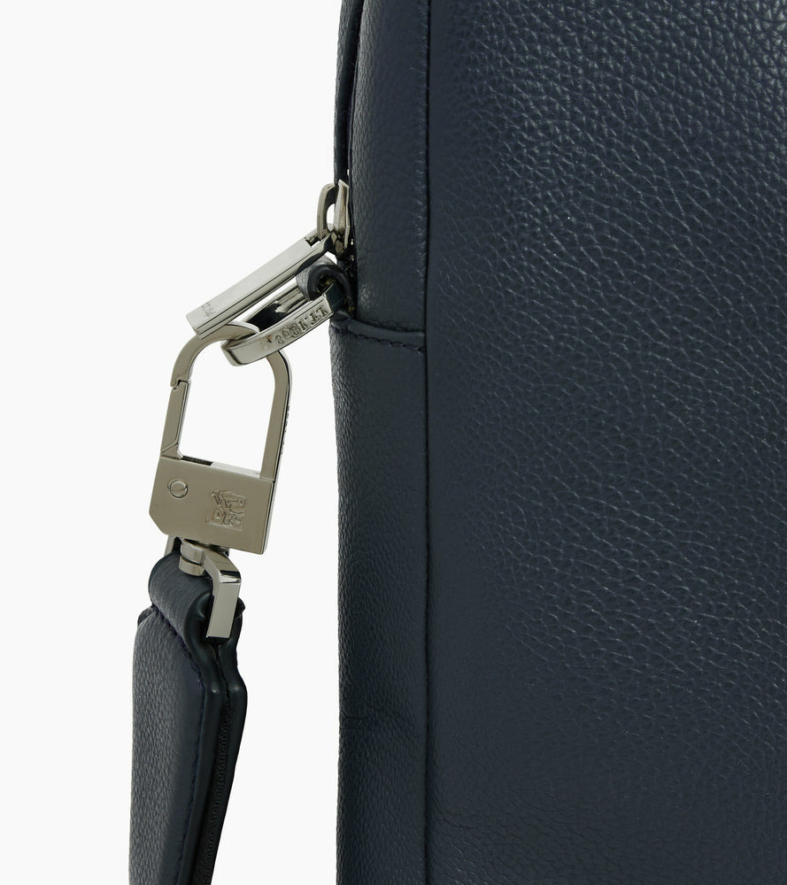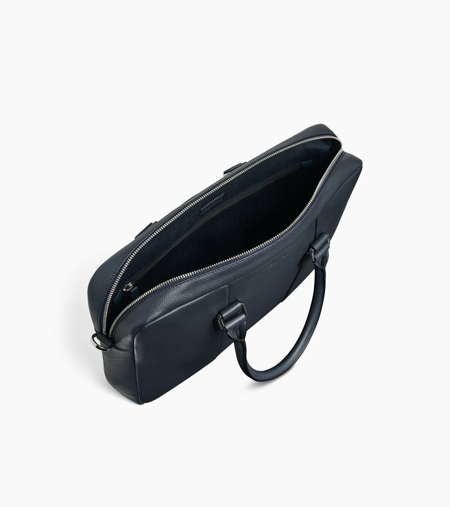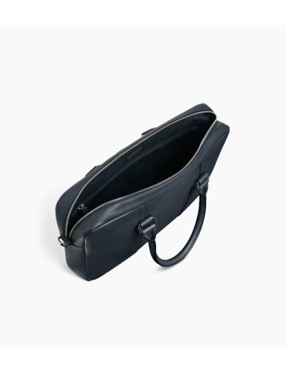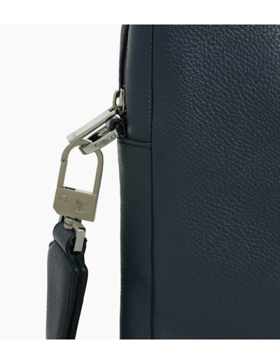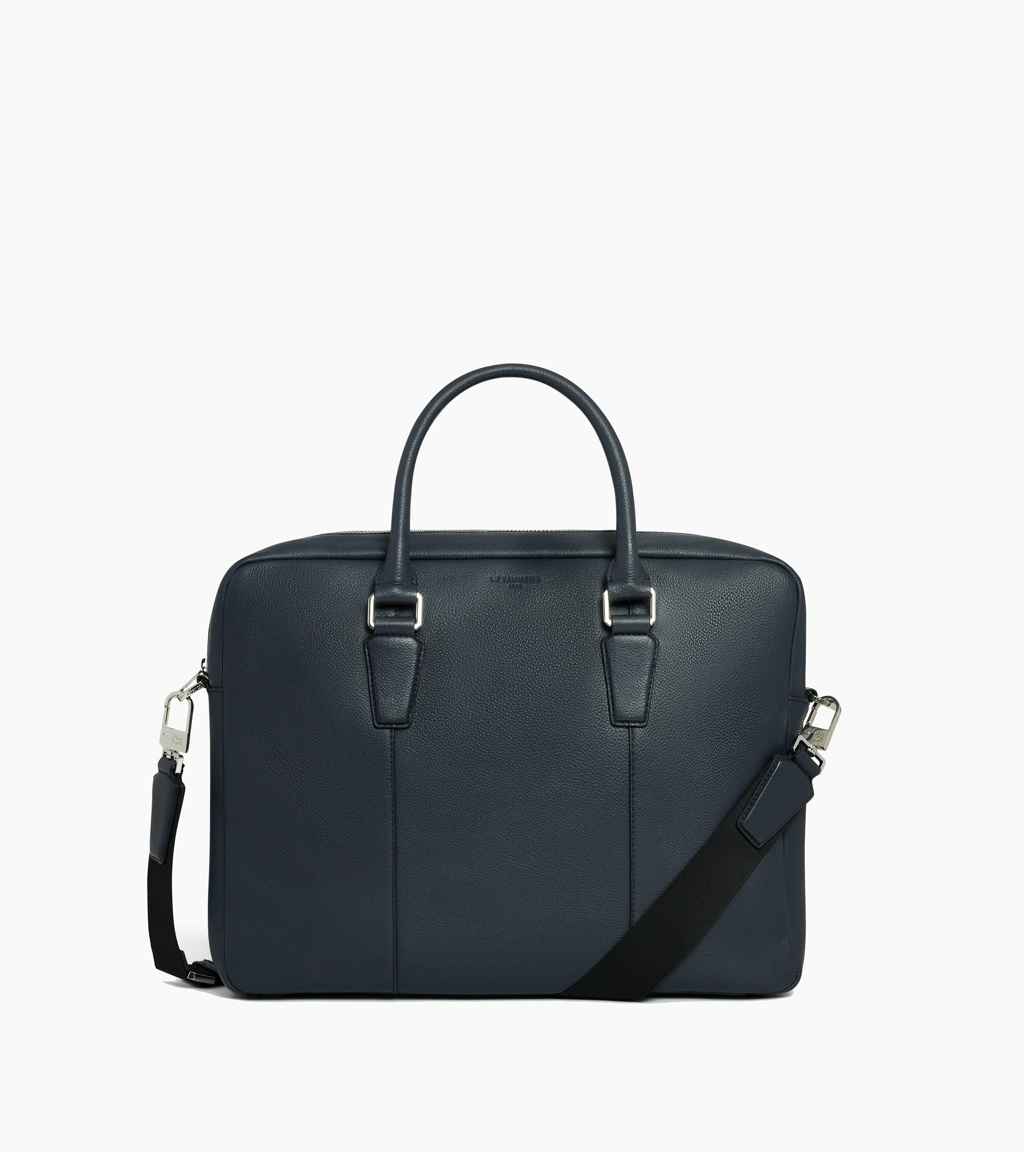 Porte-documents slim avec poche ordinateur 13-14", bouclerie gravée et marquage Le Tanneur ton sur ton. Doublure 100% coton bleu marine. Porté main, épaule ou croisé grâce à sa bandoulière ajustable et amovible.