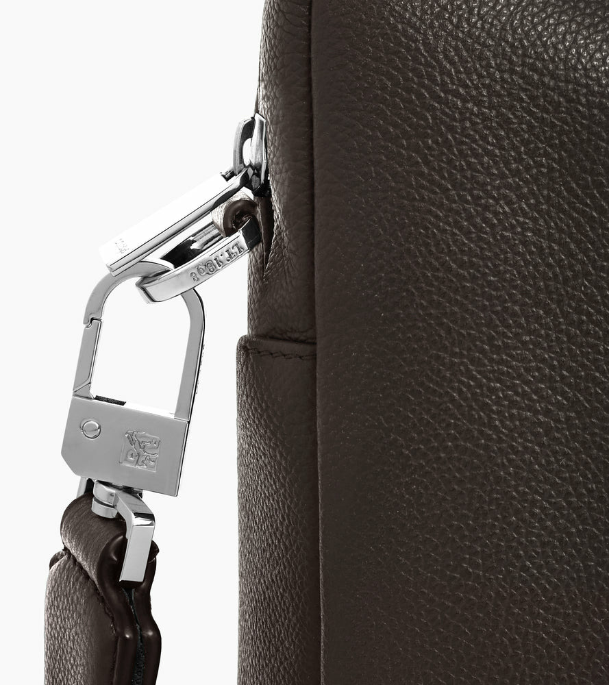 1 pression clés, 3 passants stylos, 2 poches plates et 1 poche zippée. 1 poche plate zippée arrière. Passant trolley. Bandoulière ajustable et amovible avec passant épaule.