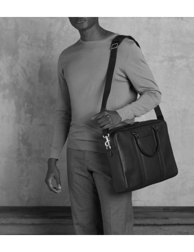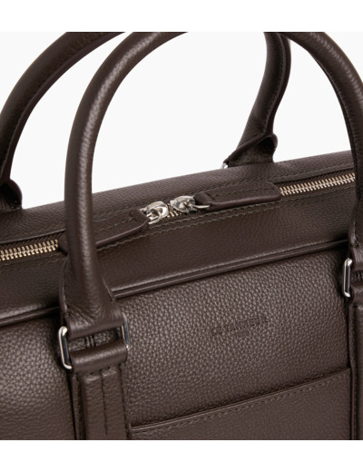 Porte-documents avec poche ordinateur moussée 15, passant trolley et marquage Le Tanneur ton sur ton. Porté main, croisé ou épaule grâce à sa bandoulière amovible avec passant épaule.