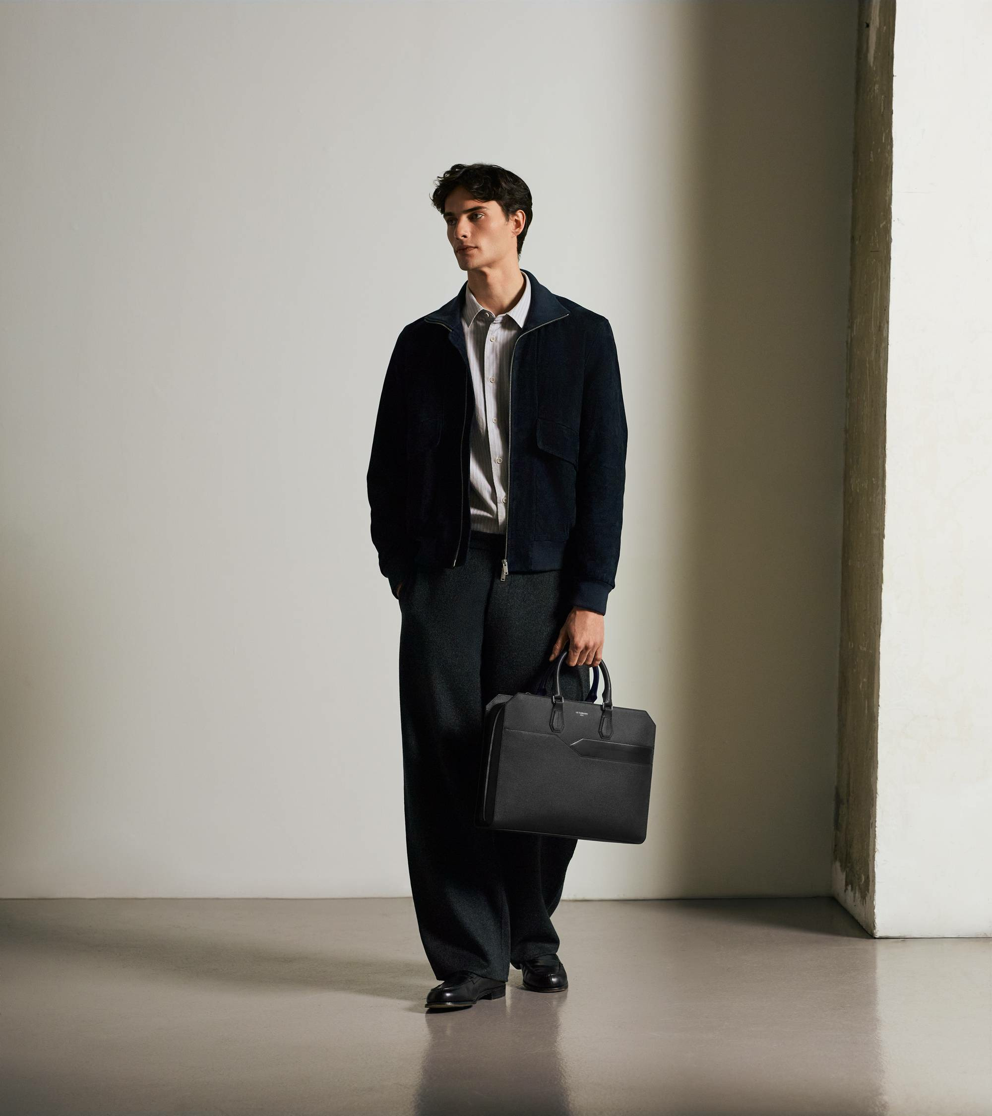 Cuir de vachette pleine fleur grain croisé et lisse. Doublure textile jacquard noir.
