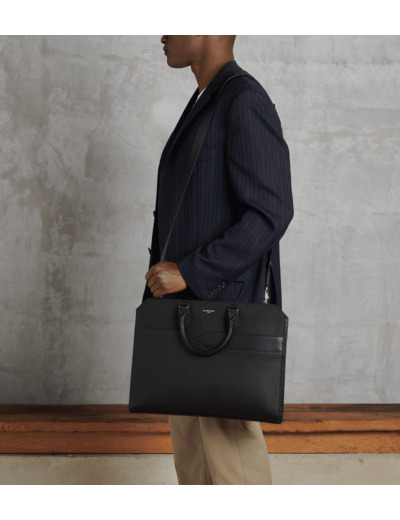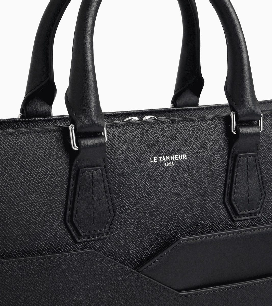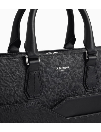 Porte-documents slim avec poche ordinateur 15. Marquage Le Tanneur et éléments métalliques finition argent. Porté main, épaule ou croisé grâce à sa bandoulière ajustable et amovible."