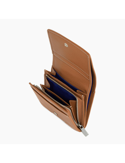 Porte-monnaie à rabat avec poche zippée. Marquage Le Tanneur et fermeture pression finition argent. Sécurité anti-RFID.